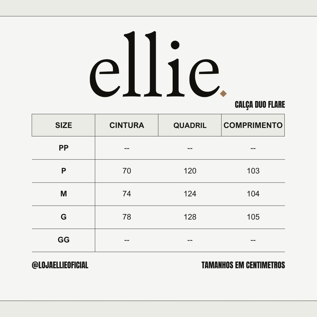 A Calça Duo Flare Ellie é a tradução do equilíbrio entre sofisticação e conforto. Com modelagem ampla e cintura alta, ela alonga a silhueta e garante movimento fluido a cada passo.